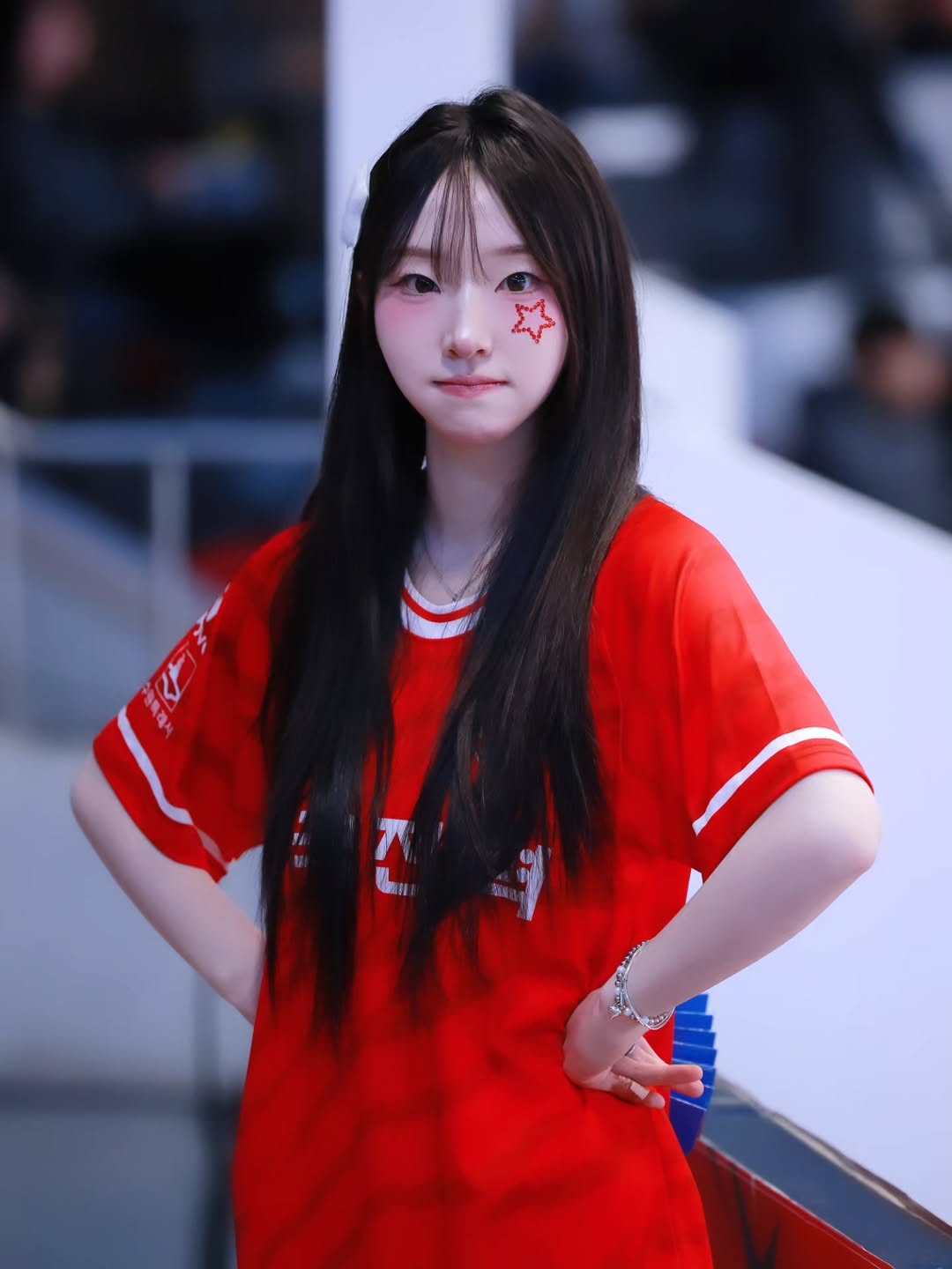 투명하고 깨끗한 피부에 발그레한 볼터치가 어우러진 그녀의 얼굴은 마치 사과나 복숭아를 떠올리게 하는 '인간 과즙' 그 자체입니다. 카메라 셔터를 멈출 수 없게 만드는 무결점 비주얼 덕분에, 챔피언스 필드 현장에서는 벌써 그녀를 찍기 위한 대포 카메라들이 즐비하다는 후문입니다.