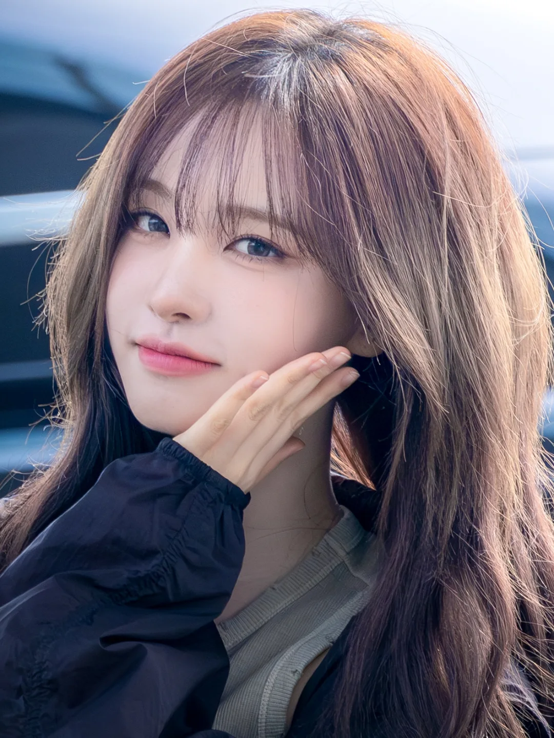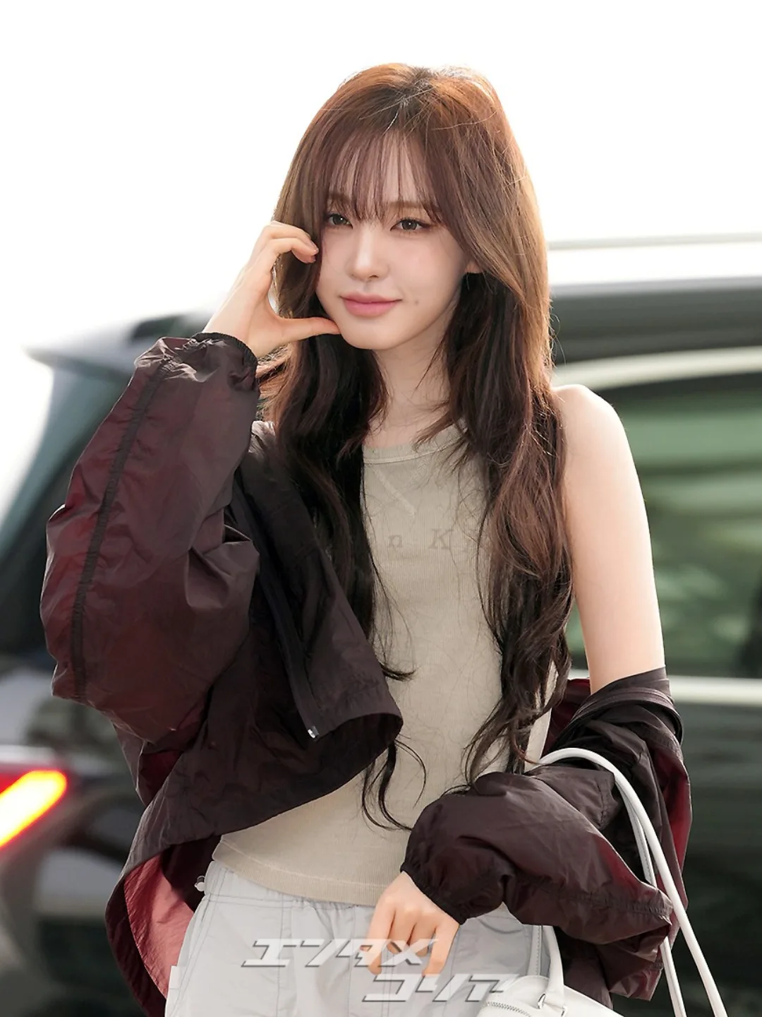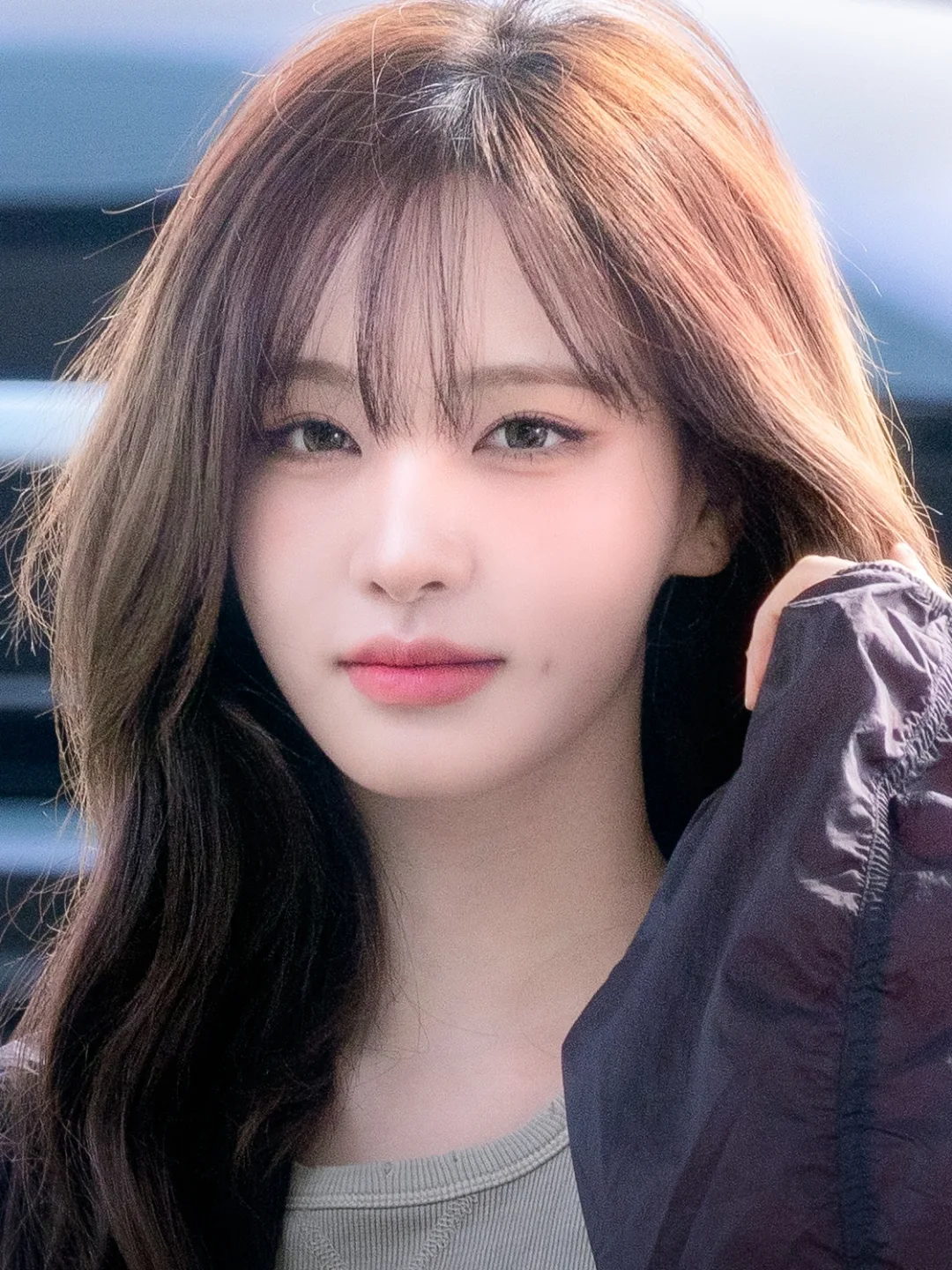 - 아우터: 가장 먼저 눈길을 사로잡은 건 딥한 브라운, 혹은 버건디 빛이 감도는 바람막이 재킷이에요. 바스락거리는 나일론 소재가 주는 스포티한 무드가 리즈 양의 힙한 매력을 살려주죠. 어깨라인을 살짝 뒤로 넘겨 연출해 답답해 보이지 않게 연출한 센스가 돋보여요.